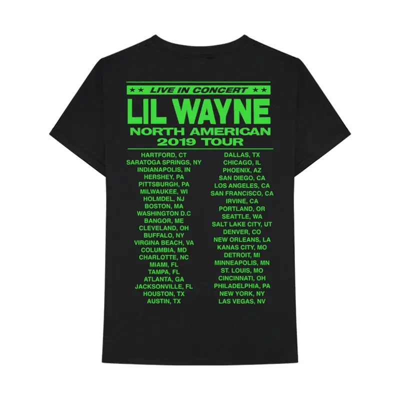 Turn heads with the Black Lil Wayne Face Flames T-shirt, a bold streetwear statement for true hip-hop fans. Crafted from soft, breathable cotton, this tee ensures all-day comfort while keeping you effortlessly stylish. The striking front design features Lil Wayne’s face engulfed in vivid flames, accented by a standout green “V,” capturing the energy of the stage. On the back, tour cities are printed, celebrating the iconic artist’s journey and connecting you to his worldwide legacy.