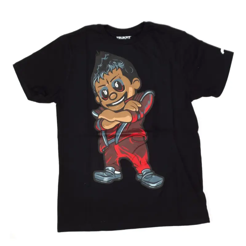 Our Black Trukfit Thriller T-Shirt brings bold energy to your everyday look. Made from soft cotton, it features a cartoon character in a red outfit with arms crossed—pure street attitude. Short sleeves and a classic crew neck keep it breathable and fresh. Our signature Trukfit label sits at the neckline for that authentic edge.