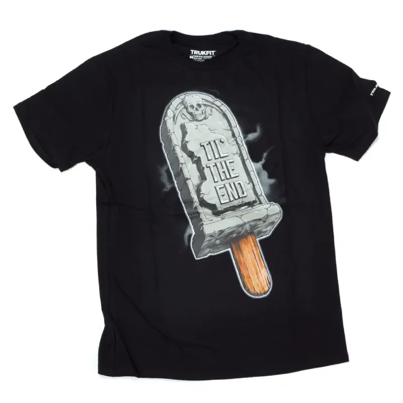 We bring you our Black Trukfit Til the End T-Shirt—built for those who ride with us all the way. This short-sleeved tee features a bold graphic of a grey tombstone shaped like a popsicle, complete with a wooden stick base. At the top, a detailed skull and the words “TIL THE END” are carved in, surrounded by smoky white wisps for an edgy finish.