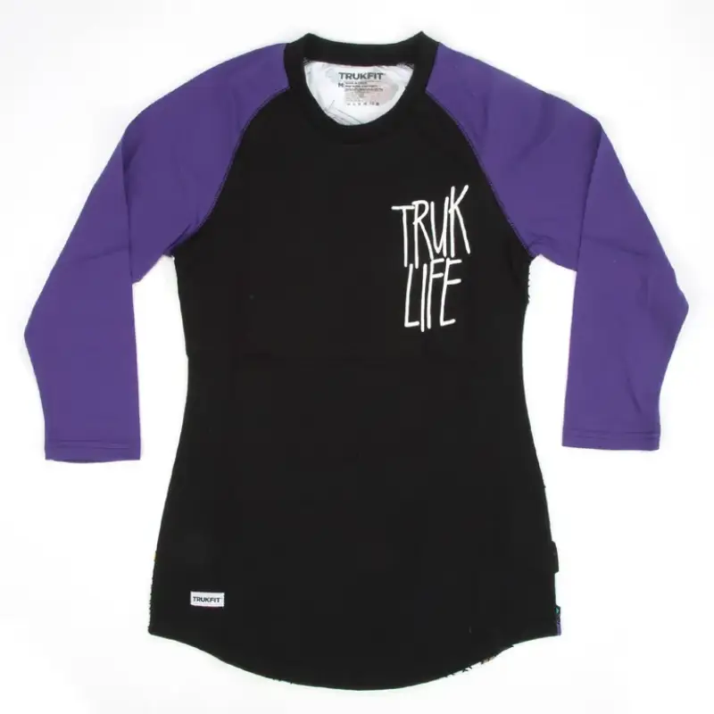 Push the limits in the Black Trukfit Truk Life Jr Raglan T-Shirt. Designed in soft cotton, it features rich purple 3/4 sleeves that break away from the usual. The bold white “TRUK LIFE” print up front brings that fearless vibe. A curved hem adds shape, while the crew neck keeps it clean and easy to wear.
