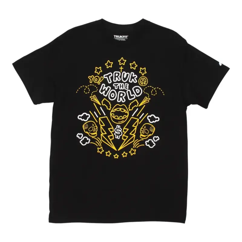 The Black Trukfit Wildin’ Out T-Shirt brings chaos in the best way. A bold doodle graphic in yellow and white covers the front—featuring stars, skulls, lightning bolts, and the shoutout “TRUK THE WORLD.” It’s loud, playful, and full of energy.