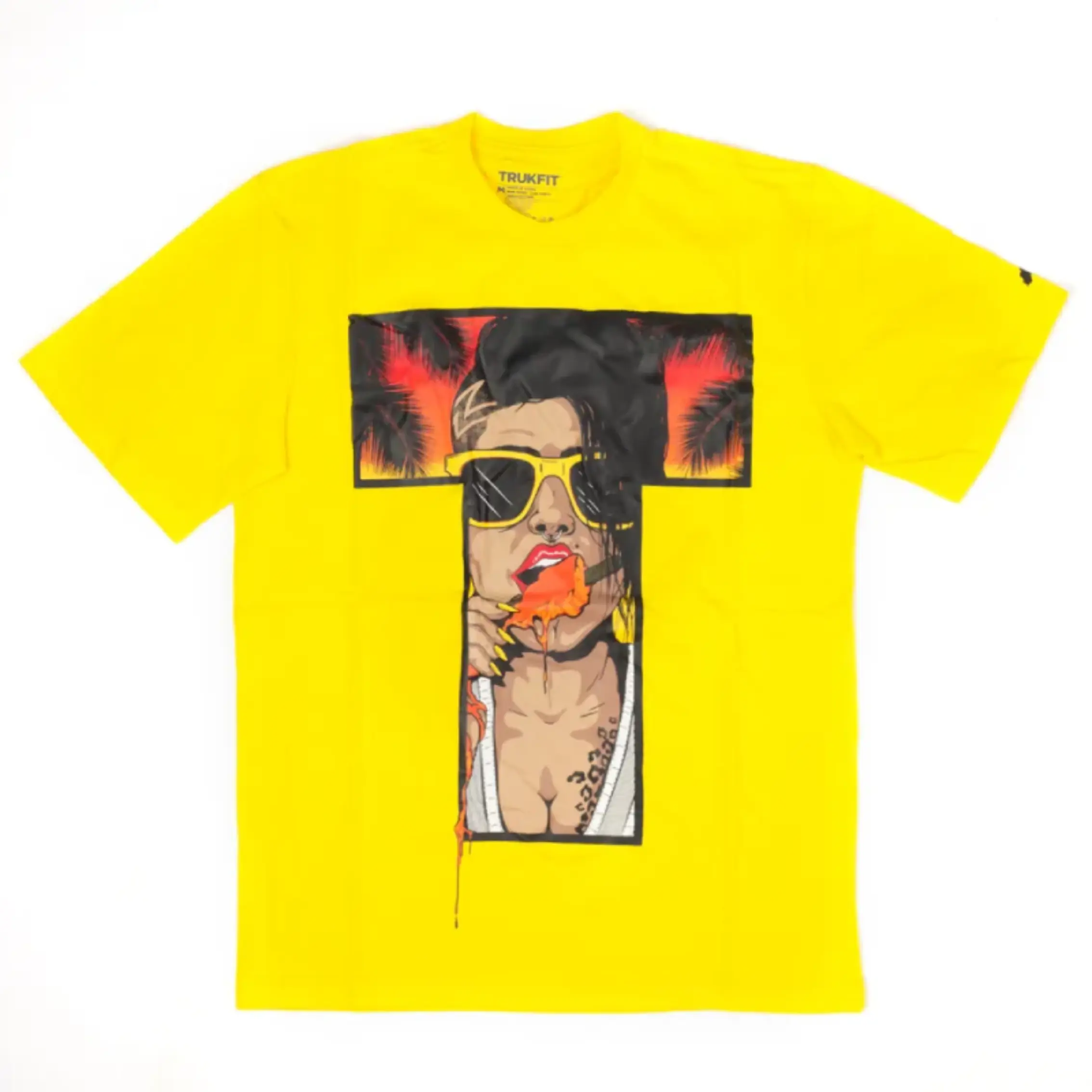 Make a bold move in our Cyber Yellow Trukfit Taste T-Shirt. This short-sleeve tee is all about attitude, featuring a striking “T” shaped graphic with a chill woman rocking sunglasses, framed by palm trees. It’s bright, loud, and unapologetically Trukfit. Made with comfort in mind, the crew neck keeps it classic while the eye-catching yellow brings the heat.