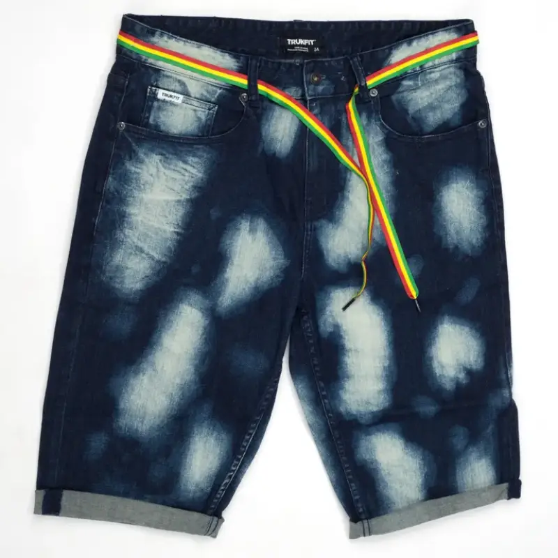 Turn heads in the Dark Blue Trukfit Denim Shorts. Made from sturdy denim with a rich blue wash. The rasta drawstring belt adds a bold pop of color. Red, yellow, and green bring instant energy. Features a classic five-pocket layout for everyday function.