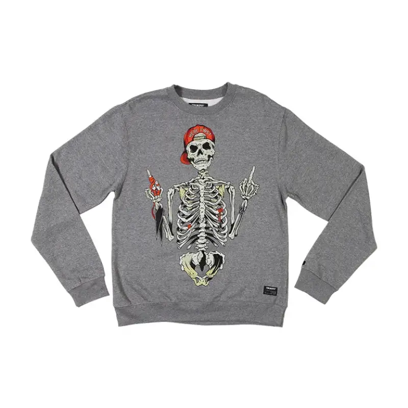 Our Grey Trukfit Bone Thugs Crewneck Sweatshirt delivers bold character with every detail. Front and center, a skeleton graphic steals the spotlight—red cap tilted, hot sauce in hand, and throwing a sign with confidence. It’s wild, playful, and loaded with that unmistakable Trukfit edge.