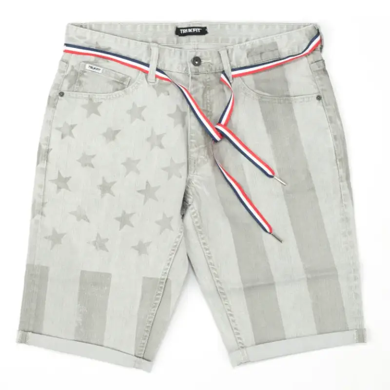 The Grey Trukfit Flag Denim Shorts blend classic denim with bold attitude. A faded American flag design gives them that worn-in, vintage edge. The red, white, and blue striped drawstring belt adds a hit of color. Built with a standard five-pocket layout for daily carry.