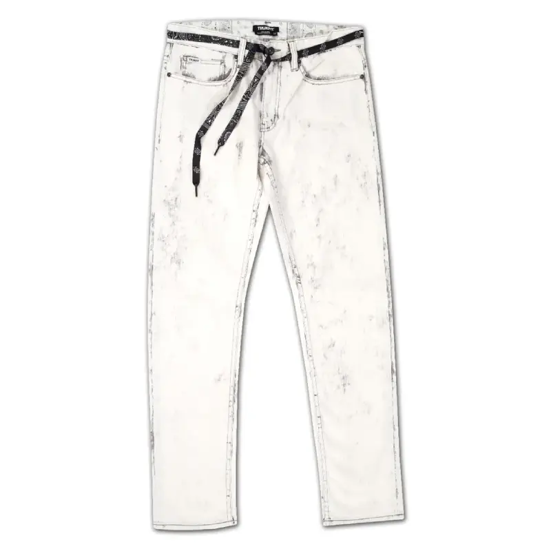 Our Light Grey Trukfit Bleached Jeans bring fresh energy to everyday style. Made from durable denim, these jeans feature a slim-straight fit for a clean silhouette. The light grey wash is bleached for that standout look. A black drawstring with a white pattern adds a bold twist. The waistband comes with belt loops and visible Trukfit branding.