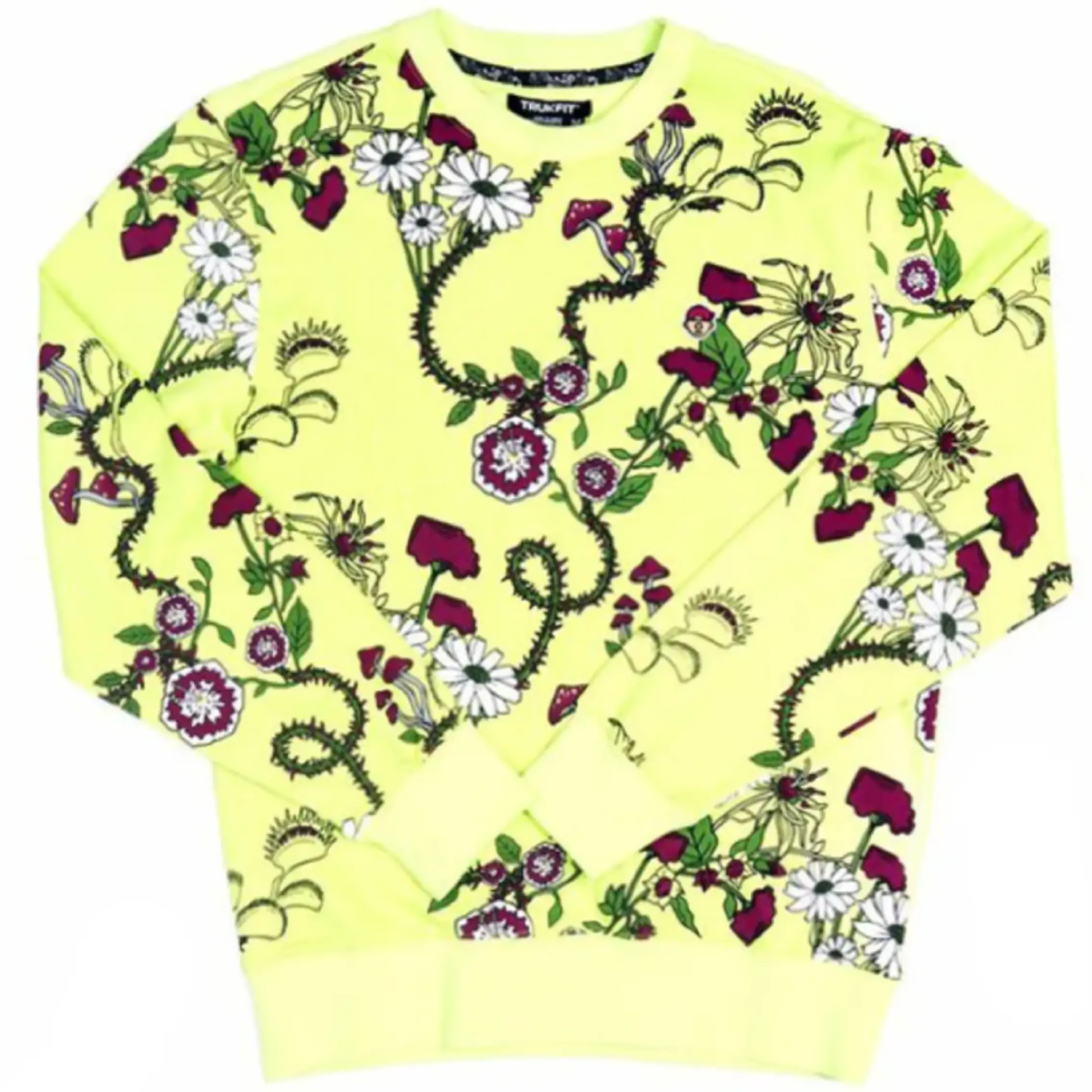 Turn heads in the Lime Green Trukfit Fly Trap Crew Sweater—a wild mix of bold prints and next-level attitude. Daisies pop, mushrooms lurk, and venomous Venus flytraps twist through thorny green vines in an all-over design that refuses to play it safe.