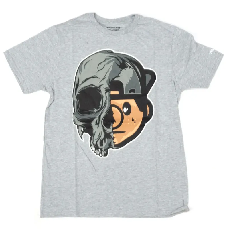 Make your fit unforgettable with the Marl Grey Trukfit 2 Faced T-Shirt’s wild split-face graphic. This short-sleeved tee features a striking split-face graphic—half dark grey skull with fierce fangs, half cartoon face rocking a backward cap.