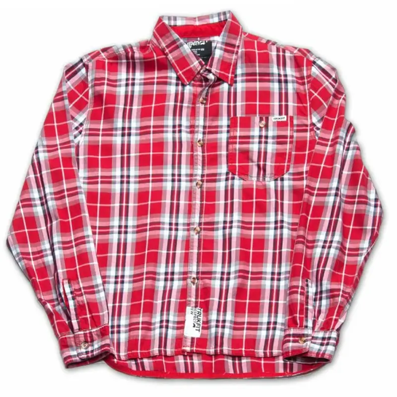 Dial it up with the Red/White Trukfit Plaid Woven Shirt—a strong mix of classic pattern and street detail that doesn’t play it safe. Long sleeves, crisp collar, and a full button front keep the structure tight. A single chest pocket drops subtle detail, while button cuffs and a curved hem keep the silhouette clean.