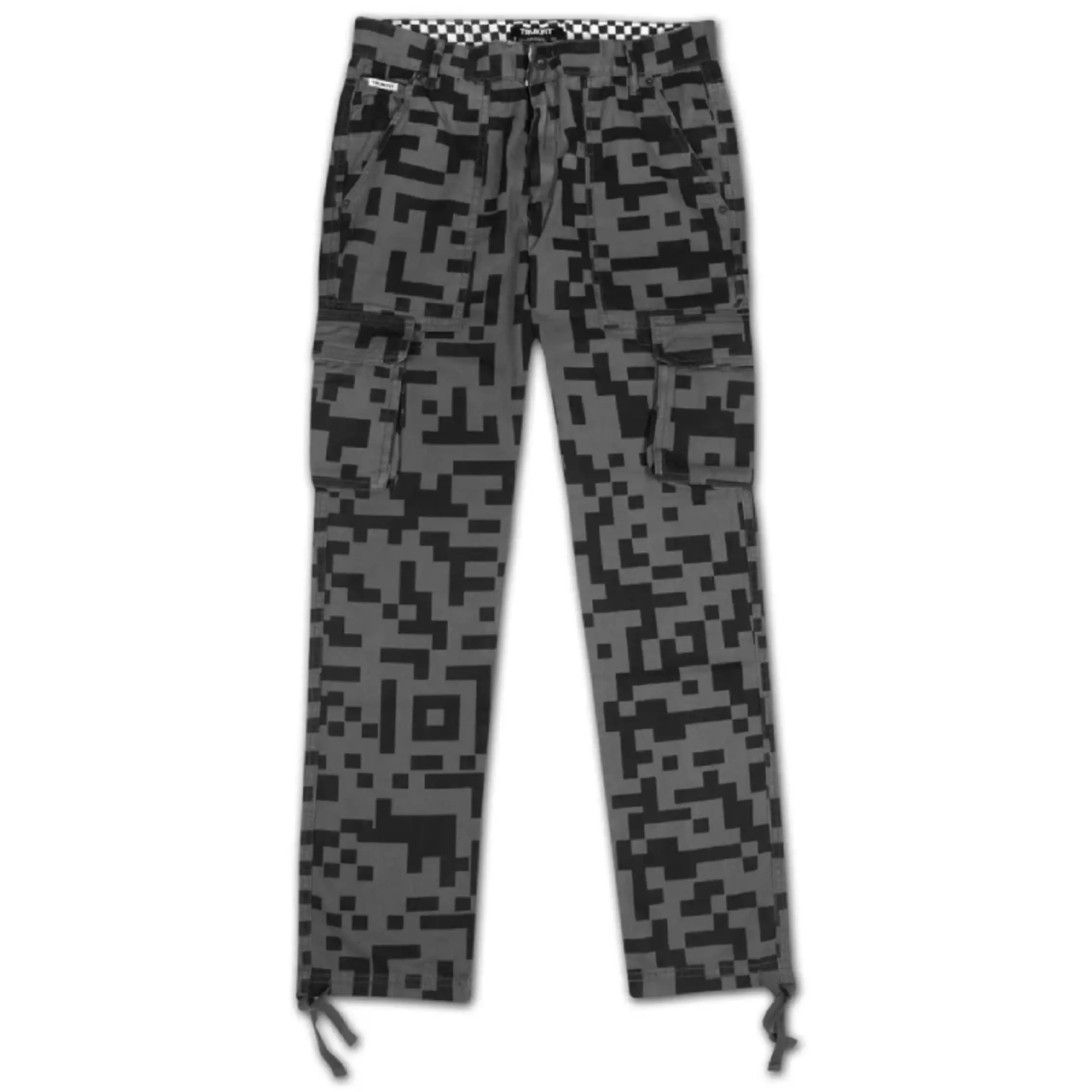 Our Trukfit Digi Cargo Pants bring utility and streetwear style together. Designed with a bold black and grey digital camo print, these cargos feature roomy side flap pockets, standard front slash pockets, and subtle rear storage. The waistband is detailed with a hidden black-and-white checkered lining and finished with belt loops.