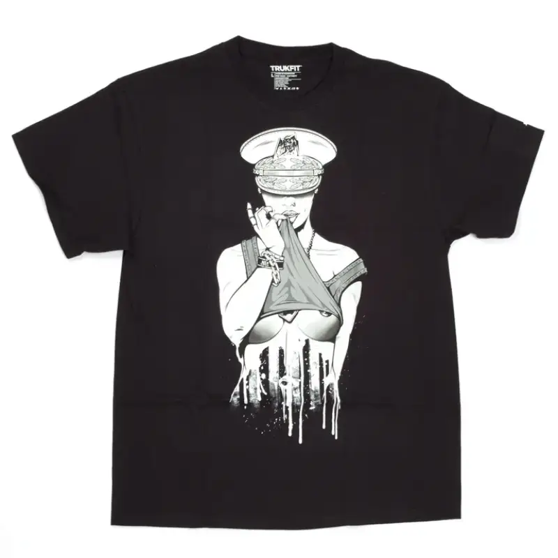 The Trukfit Private Parts T-Shirt keeps it raw with bold graphic energy. Featuring a grayscale illustration of a woman in a military hat pulling down her top, the design brings heat with subtle drips and sharp detailing. Cut from soft cotton, this short-sleeve tee delivers a breathable fit and classic crew neck shape.