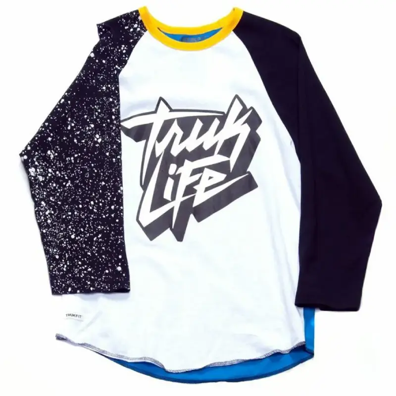 Our White/Black Trukfit Truk Life Raglan keeps it bold from every angle. This long-sleeve tee brings serious attitude with a white body, black sleeves, and yellow collar trim. One sleeve pops with a white paint splatter, while blue trim lines the inner hem. The curved drop-tail hem levels up your fit.