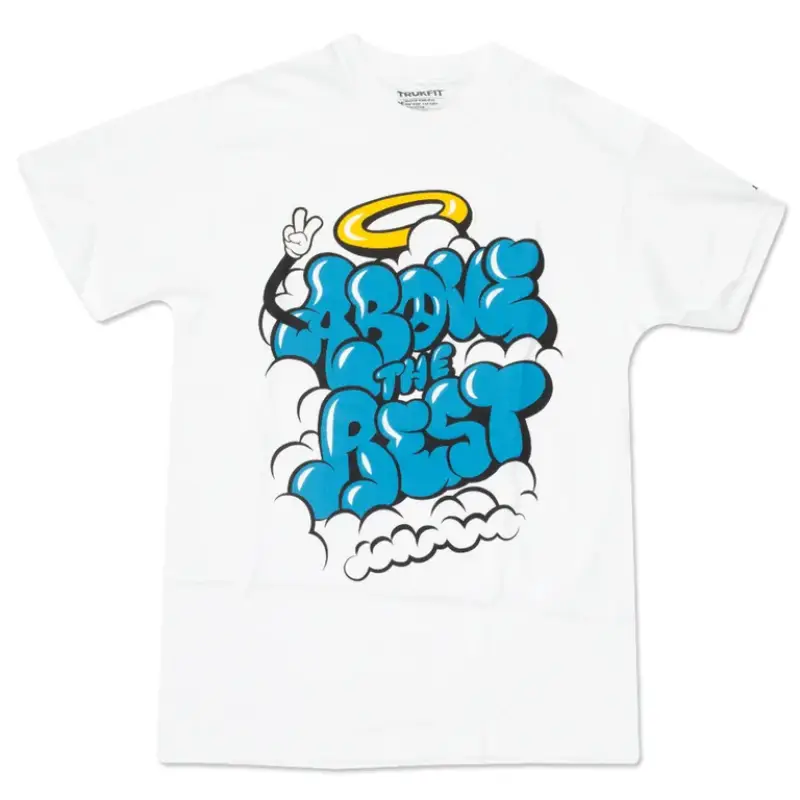The White Trukfit Above the Rest T-Shirt brings high energy with a playful twist. Front and center, the blue bubble-letter graphic reads “ABOVE THE REST,” surrounded by clouds, a halo, and a peace sign. It’s lighthearted but confident—just like you.