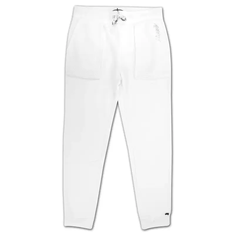 The White Trukfit Mesh Overlay Sweatpants are made to move. Clean look. Easy fit. The elastic waistband stays snug without squeezing. A black and white patterned drawstring adds sharp contrast. Mesh pockets on the front thighs give airflow and edge.