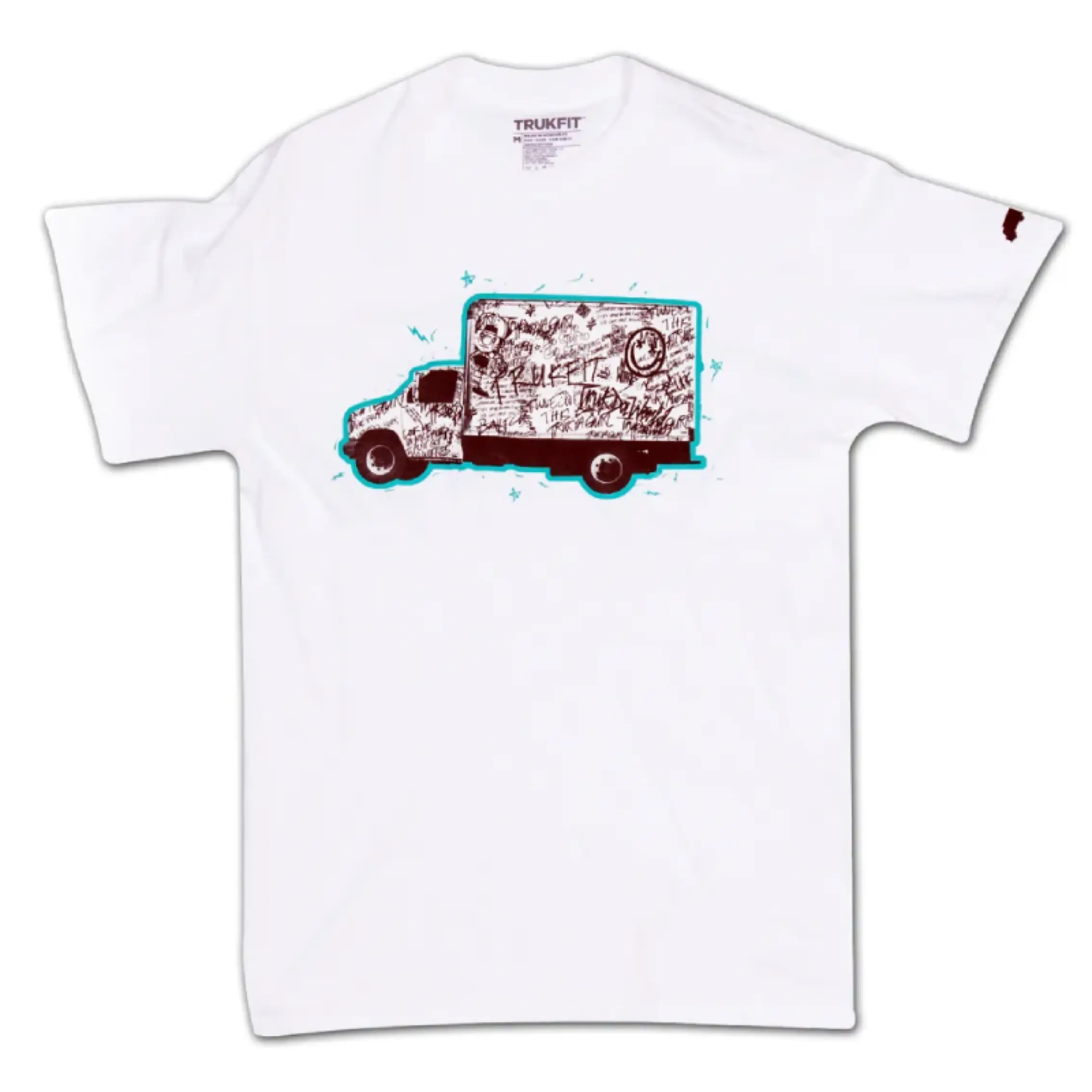 The White Trukfit Off Da Truk T-Shirt is a clean canvas with bold energy. We kept it crisp in all-white cotton, then threw on a graffiti-covered box truck graphic outlined in cyan, topped with stars for extra edge. The classic crew neck and short sleeves keep it chill and easy to wear.