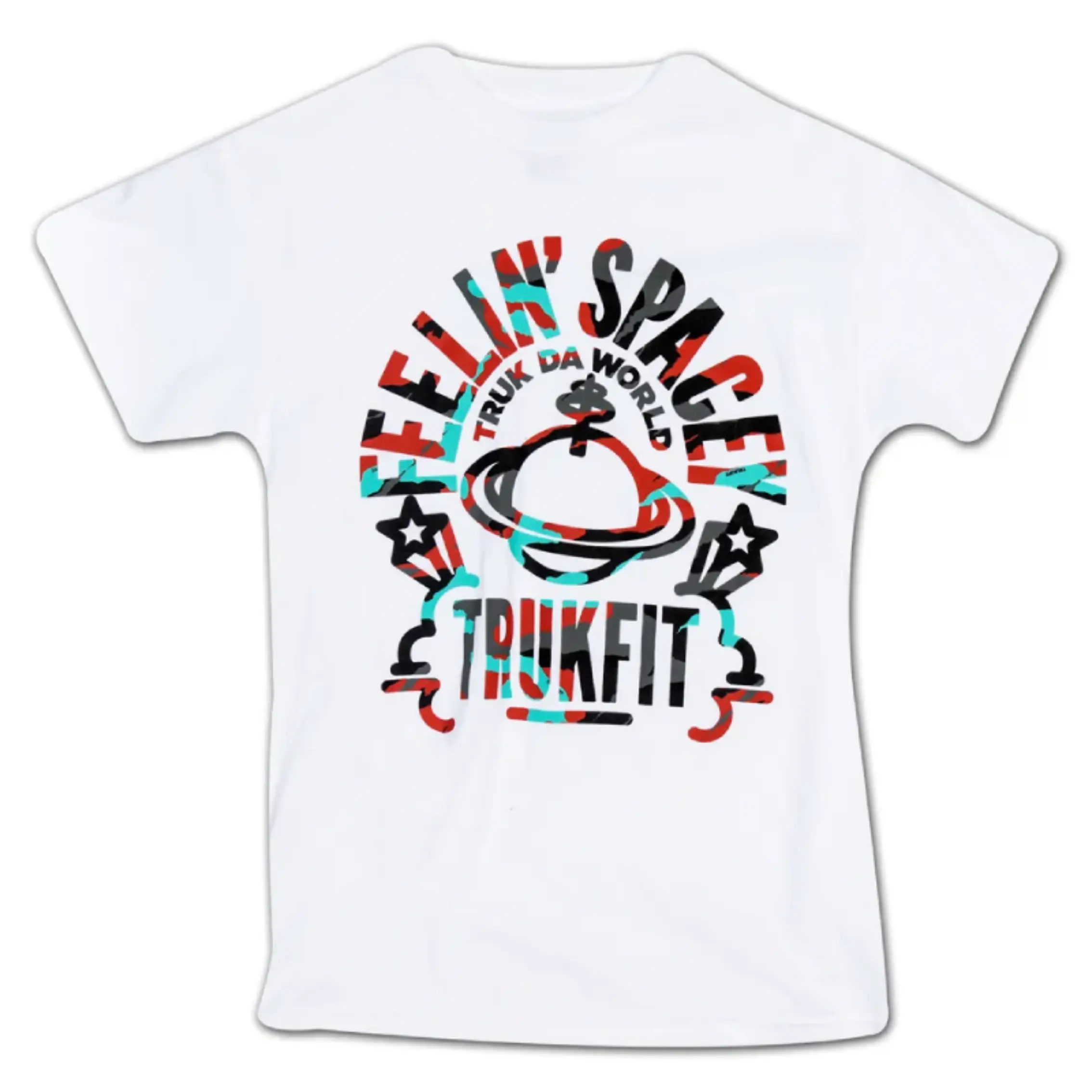 The White Trukfit Out There T-Shirt is built for the ones who stay spaced out in style. Rocking a clean white base, it’s got short sleeves and a comfy crew neck. The front hits hard with a bold space-themed graphic in red, black, and teal—featuring stars, a planet, and phrases like “FEELIN’ SPACEY,” “TRUK DA WORLD,” and of course, “TRUKFIT.”