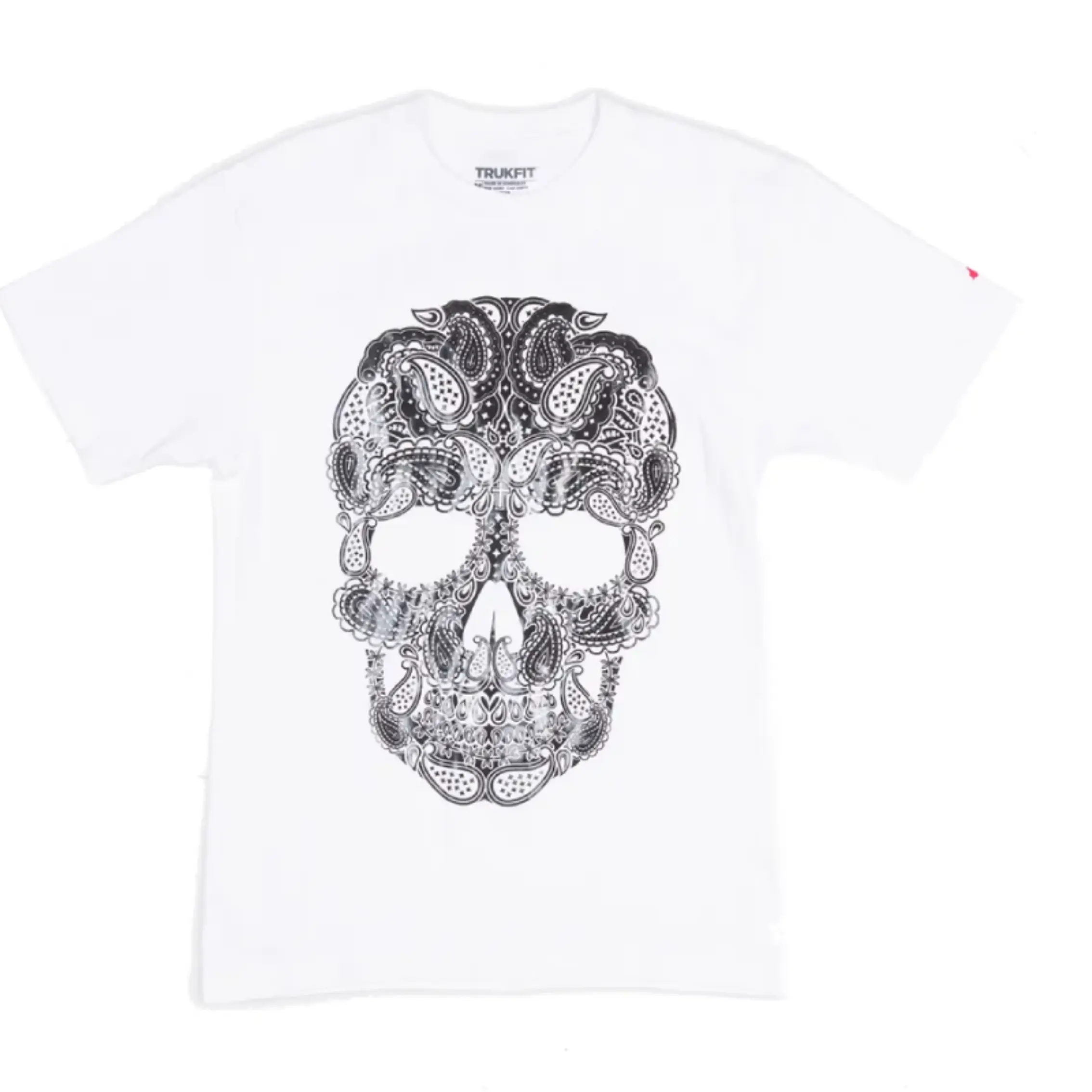 Say hello to the White Trukfit Skull T-Shirt — clean, bold, and straight fire. Made with soft cotton, this tee keeps it fresh with short sleeves and a classic crew neck. The standout? A large, detailed skull graphic on the front, built from black-and-white paisley patterns. It’s art, attitude, and street all in one.