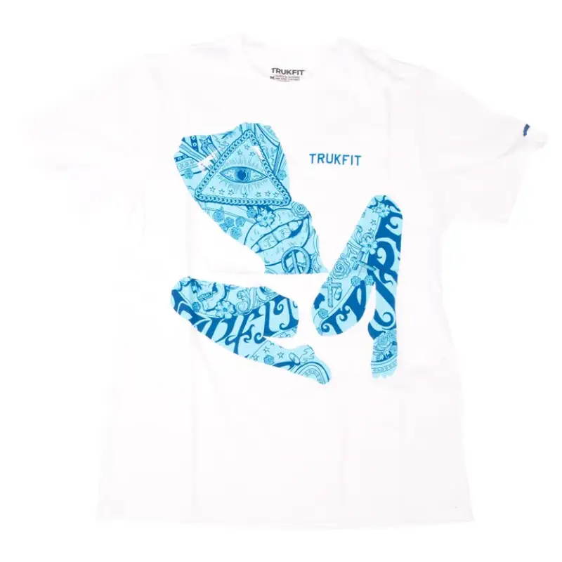 The White Trukfit Take It T-Shirt adds a creative twist to your everyday lineup. Light blue abstract shapes and bold patterns frame the clean TRUKFIT text. The design stands out on a crisp white base. Soft cotton keeps it breathable and light.